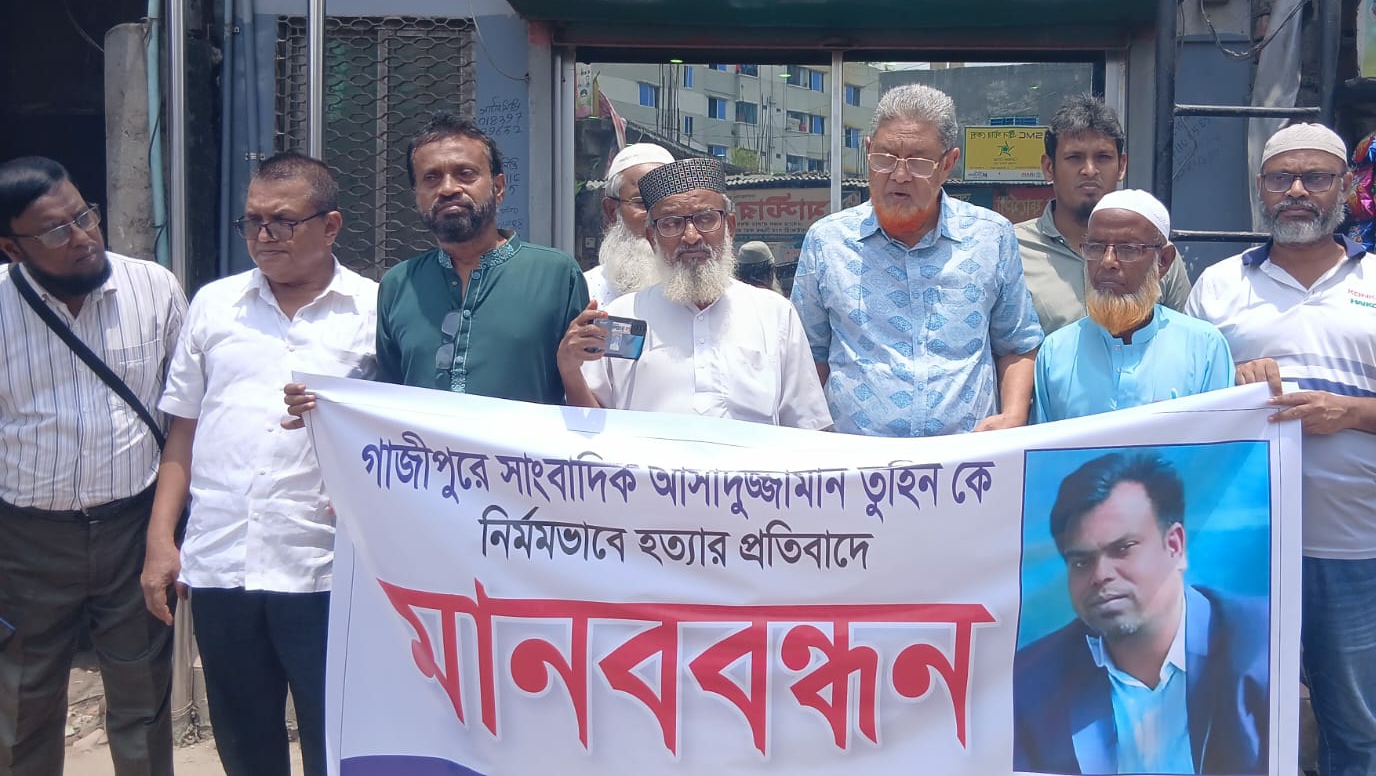 গাজীপুরে সাংবাদিক আসাদুজ্জামান তুহিনকে নৃশংসভাবে হত্যার প্রতিবাদে ও দ্রুত হত্যাকারীদের গ্রেপ্তার ও দৃষ্টান্তমূলক শাস্তির দাবিতে রোববার (১০ আগস্ট) সকাল সাড়ে ১১টায় মাধবদী প্রেস ক্লাবের সামনে মানববন্ধন অনুষ্ঠিত হয়।
