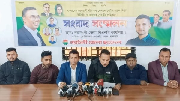 নরসিংদী প্রতিনিধি : বাংলাদেশ আওয়ামী লীগ এর ফেসবুক পেইজ থেকে নরসিংদী জেলা ছাত্রদল সভাপতির বিরুদ্ধে মিথ্যা, ভিত্তিহীন ও অবান্তর পোস্টের নিন্দা ও প্রতিবাদ জানিয় সংবাদ সম্মেলন করেছে জেলা ছাত্রদল। মঙ্গলবার