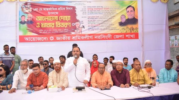 মহান মে দিবস উপলক্ষে জাতীয় শ্রমিক লীগ নরসিংদী জেলা শাখা আলোচনা সভা আয়োজন করেন, উক্ত আলোচনা সভা নরসিংদী জেলা আওয়ামী লীগের কার্যালয়ে দোয়া ও খাবার বিতরণ অনুষ্ঠান অনুষ্ঠিত হয়। জাতীয়