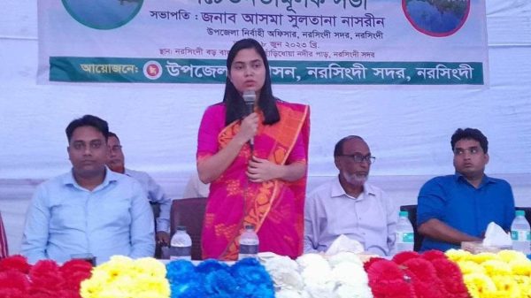 নরসিংদী জেলার উপর দিয়ে প্রবাহিত ‘হাঁড়িধোয়া’ নদী দখল ও দূষণমুক্ত করণের লক্ষে সচেতনতামূলক সভা করেছে উপজেলা প্রশাসন। বৃহস্পতিবার বিকেলে নরসিংদী বড় বাজার সংলগ্ন হাঁড়িধোয়া নদীর পাড়ে এই সভা অনুষ্ঠিত হয়।